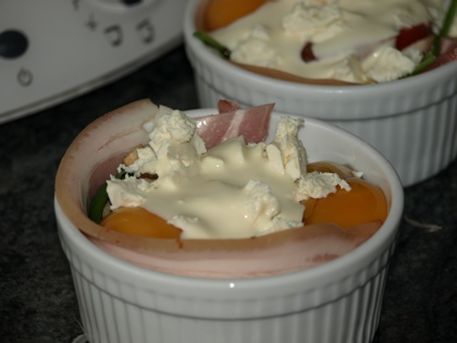 Line individual ramekins with bacon. Layer other ingredients in the centre in the order listed. Bake in a preheated moderate oven for 15 – 20 minutes or until eggs are cooked as much as you want them to be. Serve with toast.